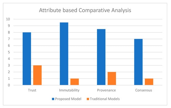 In previous work, some authors did not give the name of the consensus algorithm and some authors used the byzantine fault tolerant algorithm such as proof of work. The proof of work algorithm is time consuming as it takes approximately 10–60 min to add a transaction to a blockchain. It needs to solve a mathematical puzzle to make a transaction so resource consumption is high. It has a risk of 51% of attack. With 51% attack, if an entity is able to control 51% or more nodes of the blockchain network then the proof of work consensus algorithm will be of no use. In our proposed model, the proof of authority consensus algorithm is used. In this algorithm, a few selected nodes can act as validator to validate the transactions. Validators are nodes that have the same identity on the network as they do in the public notary database. They reveal their true identities willingly. Validators demonstrate their commitment to the network over time. They should be willing to invest their money and risk their reputation to maintain the network running smoothly. In our model, representatives from the seed supplier or rice processor company or a distributor can act as validator nodes. All the transactions will be validated by these validator nodes. The time required to generate a block is predictable and less than the proof of work algorithm because rather than involving all the nodes in the validation of transactions, only preselected validator nodes will verify the transaction. This model encourages collaboration and verification among grain supply chain stakeholders, integrates resources efficiently, and optimizes benefits. After a thorough study of the literature, a comparative analysis of traditional models with the proposed model is shown in Figure 6. As per our observation, we found that the proposed system is far better than the traditional method in all attributes. These scores represent the presence or absence of features such as trust, immutability, provenance, and consensus. A high score represents a significant presence of the particular feature in the proposed model and a low score for the traditional models represents the absence or nominal presence of the particular feature. No experts were used for the evaluation. Comparative analysis compares traditional models and the proposed model and determines the presence and absence of the above-mentioned features. Comparison is done on the basis of various attributes such as trust, immutability, provenance, and consensus. The proposed model is more trustworthy as it works in a decentralized manner because of blockchain technology. There is no central authority that can control the entire network but the model uses immutable distributed ledger therefore once the transaction is written in the ledger it cannot be deleted or modified. This model has a provenance feature. It means transactions can be traced back from their current state to their origin state and also has a consensus mechanism whereby every transaction will be executed by the agreement of the authorized nodes. High scores represent a significant presence of the respective parameter and low scores represent the absence of the same.