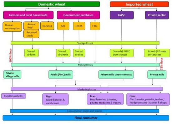 Food loss was defined by [48] as a measurable reduction in the quantity and quality of food. They arise from the fact that freshly harvested agricultural produce is a living thing that breathes and undergoes changes during post-harvest handling. Loss should not be confused with damage, which is the visible sign of deterioration; for example, chewed grain can only be partial. Damage restricts the use of a product, whereas loss makes its use impossible. In this paper, we follow the lifecycle of food approach suggested by [12] to measure and/or estimate food loss and wastage at each node of the wheat value chain in Egypt. Life cycle assessment (LCA) is a “cradle-to-grave” approach where assessment starts from the extraction of raw material from the ground and ends at a point where final waste or used product is returned to the ground [49]. In this paper, we apply LCA to assess the levels of farm-to-fork losses and wastage of wheat. For the purpose of credibility and to ensure consistency and comparability with other similar studies, we apply the Food Loss and Waste (FLW) Protocol outlined by [19] that are based on the recommendations of the international initiative led by the World Resource Institute (WRI). The FLW Protocol developed a global accounting and reporting standard, known as the FLW Standard, which enables a wide range of entities—countries, companies, and other organizations—to report how much food loss and waste is created credibly, practically, and consistently, and to identify where it occurs.