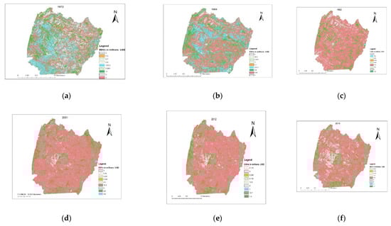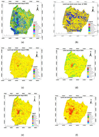 Land-use maps of the Mekelle city region in the years 1972 (a), 1984 (b), 1992 (c), 2001 (d), 2012 (e), and 2019 (f).