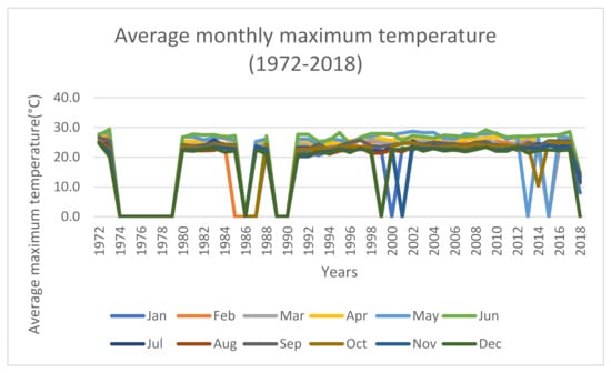 The study scrutinizes the historical climatic from 1972 to 2018 and the consequence this had on the ecosystem services in the Mekelle city region. Data were used from two metrological stations nearby stations in the Mekelle area (Mekelle airport and Mekelle observatory metrological head office). The zero values (Figure 6) are missing values. Some data across the observation were not acquired from metrological agencies.