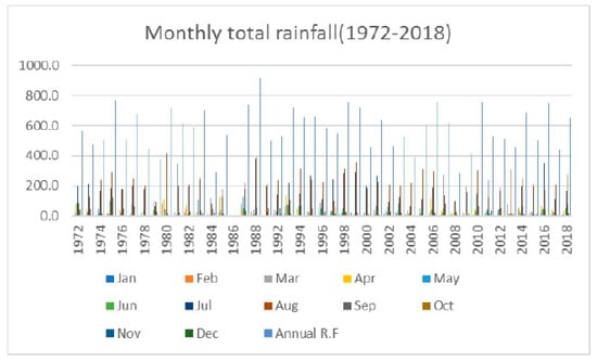 The magnitude of that trend (sen slope) is 7.25. A very high positive value of S is an indicator of an increasing climate variability trend (Table 14). Since the p-value is less than 0.05, the study rejected the null hypothesis, i.e., H0: There is no trend in the series. Therefore, there is a trend in the average maximum temperature series. The monthly total rainfall is presented in Figure 7.