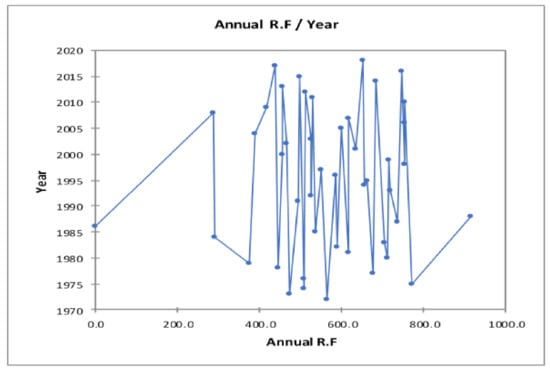 The overall gain and loss in the ecosystem from the changes for LULC of two time periods of 1984–1992 indicate that USD 106 million declines of ecosystem-service values were registered. This was corroborated by the document review. The document analysis shows that within the period 1984–1992, severe destruction of the ecosystem was observed. Various ecosystems were dramatically reduced. This was further aggravated by mismanagement of natural resources and severe damage to the ecosystem (water bodies, forests, bushes and shrubs, and riverside vegetation). Drought and environmental deterioration have historically imposed heavy costs in Tigrai, Ethiopia, and, in particular, the study area [23]. In 1985, there was a heavy drought. Annual rainfall variation (Figure 8) was observed in the study area. Environmental degradation is severe in the Mekelle city region which is threatening many parts of the study area [14] The disastrous climatic conditions and civil unrest (war between the central government and political party known as TPLF) had significantly contributed to the huge drop in ecosystem-service values. A study by [24] showed decreasing trends in the annual rainy days (1961–2003).