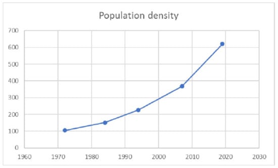 In the study area, both population number and population density were increased from 93,163 in 1972 to 556,127 in 2019 mainly due to natural increase and migration. The population density (Figure 9) in the Mekelle city region within 47 years increased from 104 to 620 which is greater than the initial period by 596.15% persons per square kilometer between 1972 and 2019 and higher than the national average in 1972, i.e., 30.14 people per square km. The current population density is much higher than the national population density of Ethiopia which is 109.22 people per km2 as of 2018. This higher population density infers that there is a need for the high demand for the ecosystem, which led to LULC change. Thus, the increasing population density may continue in putting pressure on ecosystem services. The demand for ecosystems to provide benefits/services to the population is growing rapidly.