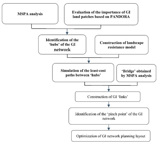 Optimizing the layout of green infrastructure (GI) is an effective way to alleviate the fragmentation of urban landscapes, coordinate the relationship between urban development and urban ecosystem services, and ensure the sustainable development of cities. This study provides a new technical framework for optimizing GI networks based on a case study of Kaifeng, an exemplar of many ancient cities along the Yellow River in China. To do this, we used a morphological spatial pattern analysis (MSPA) methodology and combined it with Procedure for mAthematical aNalysis of lanDscape evOlution and equilibRium scenarios Assessment (PANDORA) model to determine the hubs of the GI network. Then we employed a least-cost path approach to simulate potential corridors linking the hubs. We further identify the key ‘pinch points’ of the GI network that need priority protection based on circuit theory. Altogether, this framework takes patches that have a high level of ecosystem services and are more important in maintaining overall connectivity as hubs, thereby improving the accuracy of hub identification. Moreover, it establishes a direct connection between GI construction and ecosystem services, and improves biodiversity conservation by optimizing the network structure of GI. The results of the case study show that this framework is suitable for GI planning and construction, and can provide effective technical support for the formulation of urban sustainable development strategies.