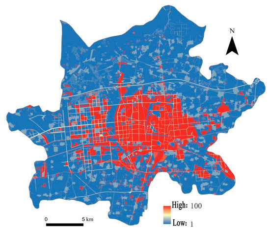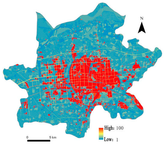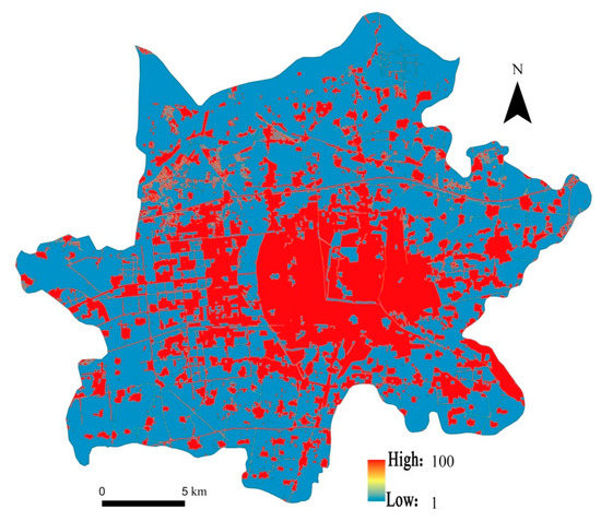 Different types of land use have different obstacles to the movement of species, that is, the value of landscape resistance is different. The landscape resistance here refers to the degree of difficulty for species to migrate between different landscape units. The higher the suitability of the patch habitat, the smaller the landscape resistance to the migration of biological species. The least-cost path method constructs a resistance surface based on the habitat suitability of the biological species based on the land use type. Through literature research, we found that there is no uniform standard for the setting of landscape resistance [37,42,43], however, the principle of resistance value setting is to set a relative value according to the ability of plaque to prevent biological movement. Therefore, this study refers to the results of previous research and sets the resistance values of different landscape types between 1 and 100 according to the degree to which they hinder energy flow and material exchange [37,42,43,44]. Forest land has the lowest resistance of 1. The resistance of urban construction land is the highest, with a resistance value of 100 (Table 2). The distribution of landscape resistance values for different types of land is shown in Figure 3.