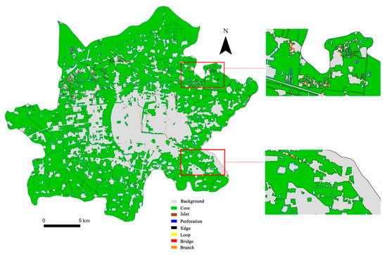 GI generally includes seven types of land [38]: public green land, garden land, woodland, water bodies, farmland, grassland and other green land. Kaifeng is located in the Eastern Henan Plain. Cultivated land, woodland, grassland and water bodies are important ecological resources in Kaifeng City [34,39]. Therefore, we classified cultivated land, forest, garden, grassland and water bodies as GI land, for which we set the pixel size to 1 pixel, the edge width to 1 pixel, and applied the eight-neighbor neighbor rule for MSPA analysis.