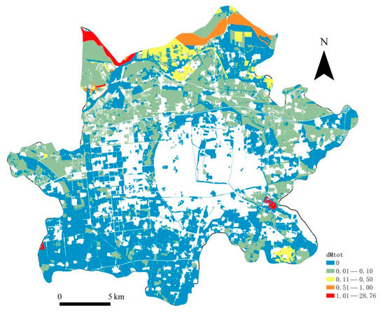 The dMtot value of the GI land patches in the study area ranged between 0 and 28.76 (Figure 7, Table 5), which means that the patches were unevenly distributed. 53.91% of the total GI area had a dMtot value of 0, of which 59.92% is cultivated land. This indicates that these patches have poor connectivity with other patches, and the conversion of these patches in the process of urban development has little impact on the overall landscape connectivity. The aggregated extent of GI patches with a dMtot value greater than 0.1 is only 26.67 km2, accounting for 7.6% of the total GI, indicating a limited extent of GI patches with high connectivity in the study area and that the overall connectivity is low. GI patches with high dMtot values are mainly water bodies. 82.68% of GI patches with a dMtot value great than 0.5 are water bodies, mainly ones distributed in the northern portion of the study area along the Yellow River.