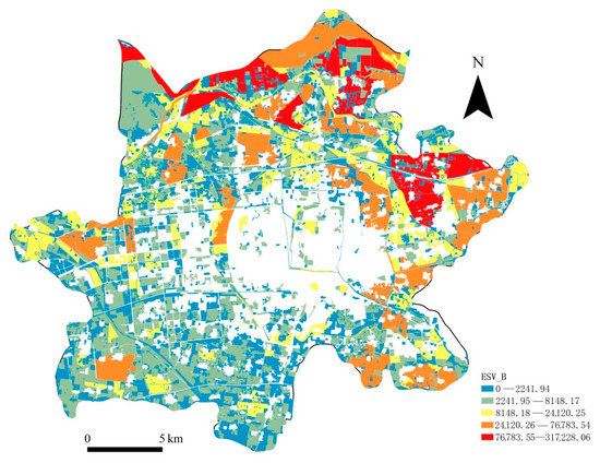 We found that most quantiles of ESV_B values in the study area are relatively scattered. The exceptions are the highest ESV_B values, which are mainly distributed in the northern Yellow River area and in the southern suburbs. Water bodies made up a higher proportion of patches with the highest ESV_B values than did forest patches.