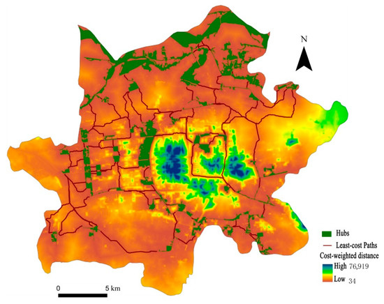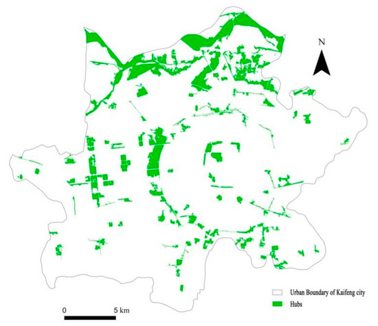 We used three criteria to determine the hubs of Kaifeng City’s GI network: (1) the ‘core’ landscape determination of MSPA analysis; (2) the ecosystem service value of each land patch; and (3) the importance of a patch in maintaining connectivity of GI patches across the urban landscape. To do this, we superimposed the MSPA analysis results of GI land, the dMtot value distribution results of GI land patches, and the ESV_B value distribution results of GI land patches and analyzed them using ArcGIS 10.3 to determine the hubs of the GI network. Finally, we selected those ‘core’ landscape types that have high ecosystem service value and play an important role in maintaining overall landscape connectivity as the hubs of the GI network.