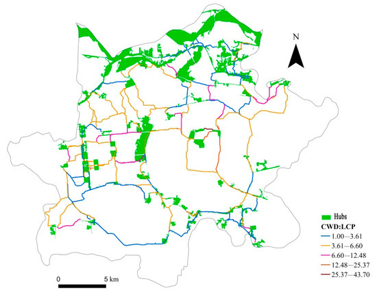 The ratio of the CWD to the least-cost path length (LCPL) can reflect the characteristics of the least-cost path. The larger the ratio, the greater the relative resistance of the path.