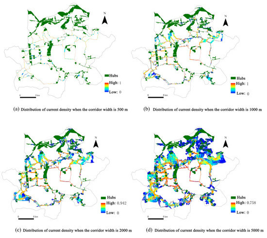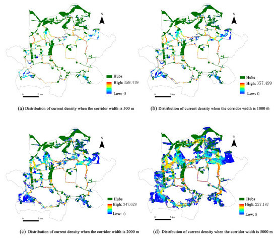 As the width of the corridor increases, there are more possibilities for biological species to move between the cores, resulting in what in circuit theory would be called ‘current shunting’ and a decrease in current density. However, only when the width of the corridor is increased to more than 2000 m does the current density value change significantly. With the increase in the width of the connecting corridor, the position of the ‘pinch point’ does not change significantly, which indicates that the increase in the width of the corridor has little effect on the connectivity of the entire landscape. However, as the width of the connecting corridor increases, the irreplaceability of the ‘pinch point’ is reduced, especially when the width of the connecting corridor is large, the current density value decreases significantly. This shows that although increasing the corridor width cannot significantly improve the overall connectivity of the landscape, it can effectively improve the ecological security of the landscape. It is consistent with the results of other related studies [45].