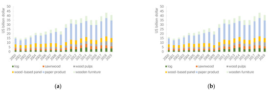 (a) Wood-based products import scale of RCEP countries from 2000 to 2019 (units: US billion dollars); (b) wood-based products and export scale of RCEP countries from 2000 to 2019 (units: US billion dollars).