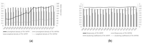 Network density is the most direct indicator to measure network structure characteristics from the overall perspective. Based on the calculation Formulas (1) and (2), the densities of TN-WFPM and TN-WFPP are obtained, as shown in Figure 2a below.