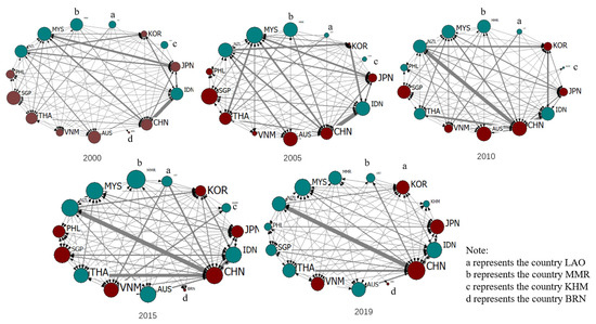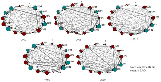 As shown in Figure 2a, the unweighted densities of the two networks are relatively stable from 2000 to 2019. The density of the TN-WFPP was significantly greater than that of the TN-WFPM, which indicates that compared with TN-WFPM, RCEP countries have closer trade relations in TN-WFPP. As for the weighted network density, it is increasing significantly, which can be seen that the average trade value of RCEP members in the two networks is generally on the rise. Compared with raw material-type products, the product-type products account for a larger proportion in RCEP countries and this proportion is increasing year by year. It shows that the trade scale of RCEP countries in wood-based products has increased, which can explain why the countries are committed to promoting the RCEP to some extent.