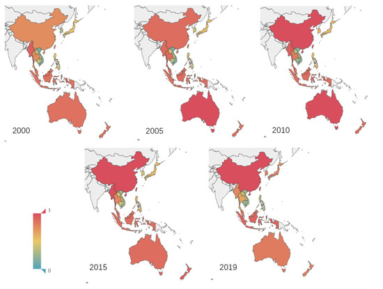 For the evolution of the coreness in TN-WFPM, it can be seen from Figure 5 that China, Japan, Korea, Australia, and countries like Indonesia, Malaysia, Thailand, and the Philippines, which are from the ASEAN countries, have relatively high coreness in general, while the coreness of Myanmar, Vietnam, Laos, Brunei, and Cambodia is relatively weak. The coreness of China and Thailand have always been in the top two. As the world’s major producer and consumer of wood furniture, paper products, and wood-based panel, China and Thailand both show massive scale in the trade of forest products and have established stable trade relations with RCEP members, granting them a higher coreness in the network. The coreness rankings of Indonesia and Vietnam show an overall upward trend, especially after the RCEP negotiations started, and the coreness of the two has risen significantly and the trade relation with the members have become closer, which reflects the motivation of the two countries to establish a regional comprehensive economic partnership agreement to a certain extent. The coreness of Japan and Korea went through a wave-shaped dynamic change, while the coreness of Malaysia and New Zealand are relatively stable at a medium level. Singapore and Philippines’ coreness both increased firstly and then decreased. The coreness of Australia changed in the opposite direction especially after 2010, and with the advancement of RCEP negotiations, the coreness of Australia has increased more obviously. Myanmar, Cambodia, Laos, and Brunei are relatively stable in the bottom four of the coreness, which is related to the fact that their international demands and supplies of wood-based products are relatively small.