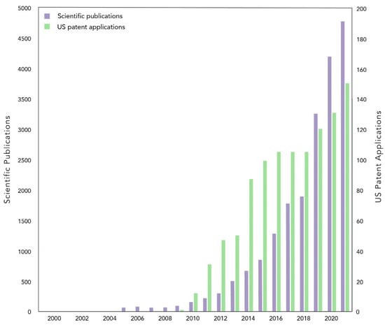 The rise in interest in biochar, demonstrated through the number of scientific publications per year (purple, left y-axis) and the number of United States (US) patent applications (green, right y-axis). Data located based on keyword searches of the word “biochar” [,].