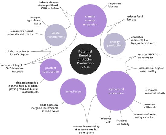 Conceptual diagram of the potential benefits of biochar production and use. Primary benefits (bold purple) are sized according to the number of related publications []. Co-benefits are rendered in light purple. Benefits included here are not exhaustive or mutually exclusive, nor will they be consistently realized depending on variables in the biochar and in the system in which they are utilized.
