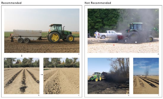 Practices that are recommended (left) and not recommended (right) for the application of biochar to agricultural lands. On the left, a biochar is applied to the field at 40% moisture content (a), using a subsurface banding technique (b) in which biochar is immediately covered by soil (c) so it is less likely to contaminate air or water as the result of wind- or rain-driven erosion. On the right, a biochar is applied at 0% moisture content (d), on a windy day (e), and left on the soil surface where it became airborne (f). Photo credit for (a–c) to Sanjai J. Parikh, (d) to Brian Kozlowski at the University of Tennessee, and (e,f) to Iris Holzer at the University of California, Davis.