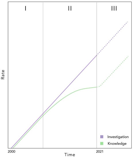 Conceptual diagram of the rate of biochar investigation vs. the rate of biochar knowledge accrual. In earlier stages of biochar research (Stage I), publications and knowledge were accrued at nearly the same rate. Currently (Stage II), research outpaces knowledge, with an increase in publications not necessarily leading to a concomitant increase in new, novel, or mechanistic understanding. In the future (Stage III), the scientific community can advance knowledge with every publication by working together creatively to produce deeper, more mechanistic results which optimize the environmental, ecological, and agricultural benefits of biochar.