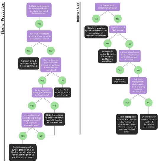 Conceptual decision trees for the sustainable production (left) and use (right) of biochar, which may aid in optimizing environmental and economic benefits.