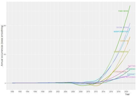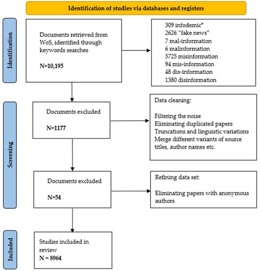 Alonso Garcia et al. focused on the impact of fake news on the scientific community. They took into consideration 640 scientific articles from WoS, excluding other types of documents. Their findings suggest that, although this is “a line of research whose assent is emerging at the same time is vertiginous” [27] (p. 14), there is a keen/intense need to “continue on a path that combines the eradication of the phenomenon, as well as education for the prevention of its consumption”. In the same vein, the purpose of the research carried out by Wang [28] on 387 articles indexed in WoS was to identify the different forms of fake news and other related concepts and to explore the recent trends of research in this field. The author concluded that not all research on disinformation is related to the investigation of fake news. Some papers just discussed errors and disinformation in their fields of research. However, this study limited the publication year to 2019 and earlier.