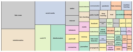 The top 20 authors keywords occurrences are fake news (1106 papers), misinformation (899), social media (852), COVID-19 (499), disinformation (467), Twitter (229), internet (164), infodemic (141), post truth (137), coronavirus (136), social networks (132), fact checking (125), media (123), memory (123), journalism (122), communication (116), pandemic (114), false memory (113), machine learning (112) and public health (103).