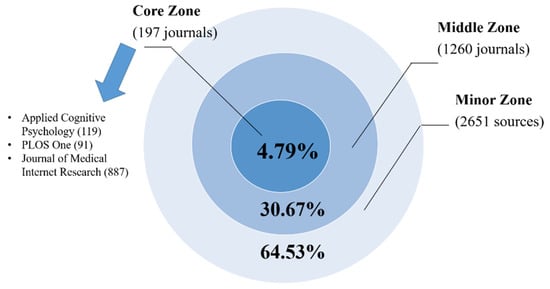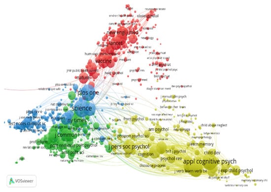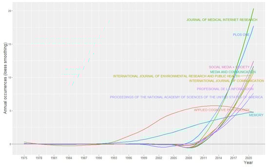 Thus, we identified three journals as a “core” source: Journal of Medical Internet Research (887 papers), Applied Cognitive Psychology (119) and PLoS ONE (91). In the top 10 most productive journals we find Memory (75 papers), Social Media + Society (50), International Journal of Communication (48), Media and Communication (44), International Journal of Environmental Research and Public Health (43), Profesional de la informacion (40), Proceedings of the National Academy of Sciences of the United States of America (37), American Journal of Public Health (36), Memory & Cognition (36) and New Media & Society (35).