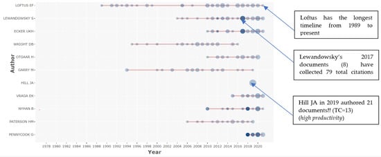 For the period 1975–June 2021 we identified 26,242 authors. The “top 10” authors published 321 papers (3.58%) in total and include the following scholars: Elizabeth Loftus (54 papers), Stephen Lewandowsky (40), Ullrich K. H. Ecker (35), Daniel Wright (26), Emily Vraga (25), Henry Otgaar (24), Garry M. (22), Hill J.A. (21), Paterson H.M. and Pennycook Gordon (19).