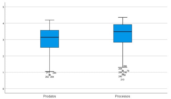 Figure 2 and Figure 3 show the distributions of the dependent variables “Product Innovation” and “Process Innovation”, and of the independent variables, respectively. Only the variables “Development/employees training” and “Quality/conception and product design” were not observed outliers. In the remaining variables, outliers are identified, most of them with values of less than 1. This presence of outliers can lead to less accurate estimates when using the method of ordinary least squares.