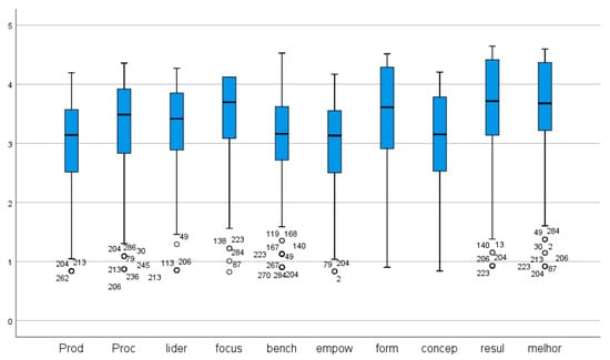 In comparing the results of the linear regression using the least squares method with those of the robust linear regression, it is noted that the standard errors are slightly smaller for the robust linear regression. It is also verified that the coefficients of the variables “Quality/conception and product design” (Beta = 0.408; t-Student = 4.779) and “Continuous improvement” (Beta = 0.415; t-Student = 4.500) are higher, and the coefficients of “Benchmarking” (Beta = 0.190; t-Student = 3.327) and “Data analysis/measurement of results” (Beta = −0.318, t-Student = −3.572) decreased slightly, all being significant at a level of 1%.