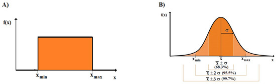 In this Monte-Carlo approach, an important factor is the estimation of the PDF followed by each variable. Then, the application of the methodology begins with the estimation from the historical database of the PDF followed by each variable. To determine the PDF followed by the different variables, several goodness-of-fit tests have been performed for the data; in particular, the Kolmogorov–Smirnov test has been used to estimate the best fit PDF. In the case that normal is the best-fit PDF, complementary tests such as Chi-square, Shapiro–Wilk statistic and Z-value for both skewness and kurtosis have been performed to reaffirm that the distribution of this variable is compatible with the normal distribution. Uniform and normal are considered to be the most common PDFs found for the different variables. In the case of a uniform PDF, only the minimum (xmin) and maximum (xmax) values allowed to the variable have to be determined (Figure 2A). For a normal PDF, the mean and variance have to be determined, but also the desired coverage, which usually is 95%, then the minimum and maximum values are determined as displayed in Figure 2B.