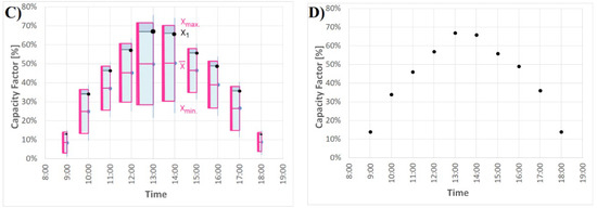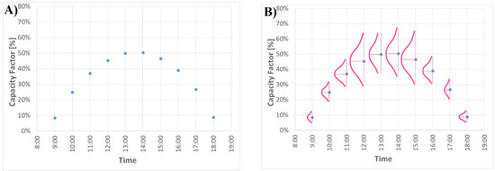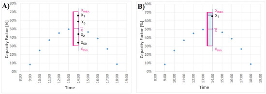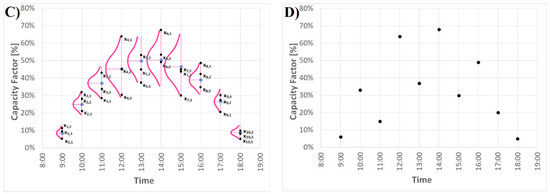 Random sampling of Wilks’ methodology consists of 59 random combinations of groups of values for all variables involved in the electric energy balance at all database measurement points. Since all databases have a temporary resolution (number of daily measurement points, Figure 3A), a random sampling should theoretically be carried out for each one of these points. Each sampling should independently follow the variable PDF at each measurement point (Figure 3B displays a variable following different Gaussian PDFs for each time data point). However, an “independent random sampling” for each daily measurement point (Figure 3C) is not an appropriate estimation because there could be a very large variation between sampled values of two adjacent points of a variable. In the extreme case, it would be possible to change from maximum to minimum values of a variable between two adjacent measurement points, having the variable a very pronounced saw-tooth shape (Figure 3D), a condition that would be almost impossible to happen in reality.