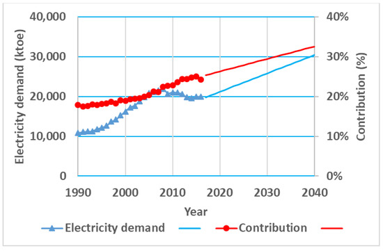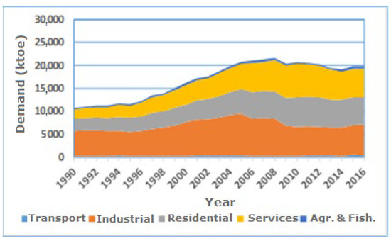 Concentrating on the example of the methodology application, apart from the economic crisis period (2008–2013), there has been a continuous increase in the electricity demand in Spain, mainly from the industrial, residential, and service sectors, as can be deduced from Figure 5 obtained using the IEA database [55]. Figure 6 shows the data for total electricity demand and the fraction that electricity represents in the total consumption of final energy and their lineal extrapolation up to the year 2040. The obtained results indicate an increase in the contribution of electricity up to 32% with a demand of electricity of about 30 Mtoe (3.49⋅102 TWh), a factor 3 over the values in 1990.