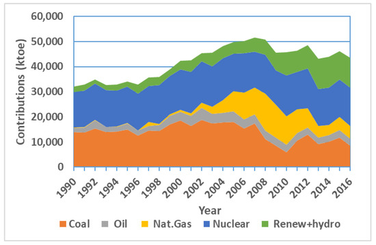 Contributions from each primary energy source to electricity generation [55] are shown in Figure 7. Using the specific emissivity of the fossil fuel detailed at Table 1, and the amount of each fossil fuel contribution to electricity generation, we can deduce the CO2 emissions in this generation process. Total emissions and its exponential extrapolation up to zero carbon emissions in 2040 are plotted at Figure 8.