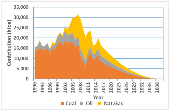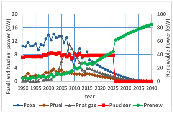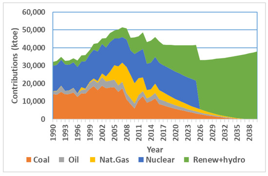 Using Equation (4), we can calculate the amount of each fossil fuel contribution and its evolution up to be null in 2040. The results are plotted in Figure 9; applying Equation (7), the required amount of renewable energy is deduced and displayed in Figure 10. The contribution of primary energy sources to the electricity generation are calculated assuming a nuclear shutdown of all the nuclear plants in Spain for the year 2025.