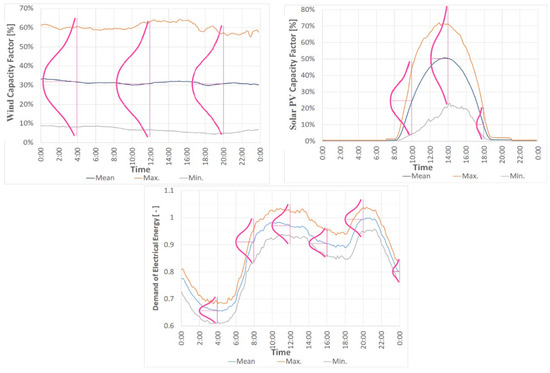 REE data for each variable with daily variation (demand, wind and solar photovoltaic) has been analyzed and their PDFs have been calculated. As the REE data have a resolution time of 10 minutes, then 144 time data points per variable and day are available. Consequently, 144 different PDFs per variable can be obtained. All of them have turned out to be normal distributions, whose mean and standard deviation values are summarized in Table 3. Figure 12 displays the mean, maximum and minimum values along the day and, superimposed, several PDFs for specific time values. Along the complete study, we are assuming that these PDFs maintain the same structure up to 2040.