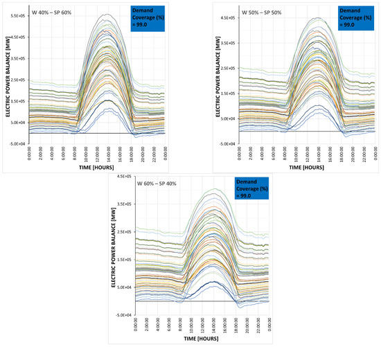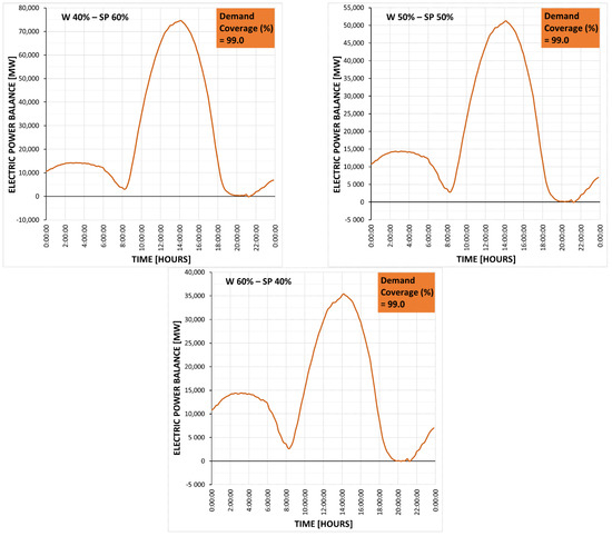 Considering the intra-daily variations in the electricity generation and demand, the procedure described in Section 2.1 has been performed. The obtained results, after the iterative process, are shown in Figure 13. The total renewable power needed to cover the demand with a reliability of 99% for the three considered renewable distribution between wind and photovoltaic sources are 191.1, 222.4 and 268.6 GW, respectively.