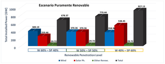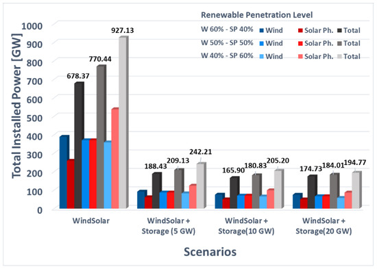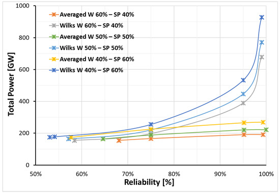 The results of the two statistical analysis models for different demand coverage are displayed in Figure 15. Significant increases in the needed power are obtained when the most accurate approach, the Monte-Carlo method, is used. As shown in Table 5 and Figure 15 and Figure 16, total installed powers between 700 and 900 GW are needed to cover the electric demand for all the three renewable penetration level scenarios. In the case under study, the differences in the total installed power between the consideration of an averaged day and the Monte-Carlo analysis to carry out the calculations led to a factor higher than 3 in the power requirements for reliabilities approaching 100% of the time demand coverage.