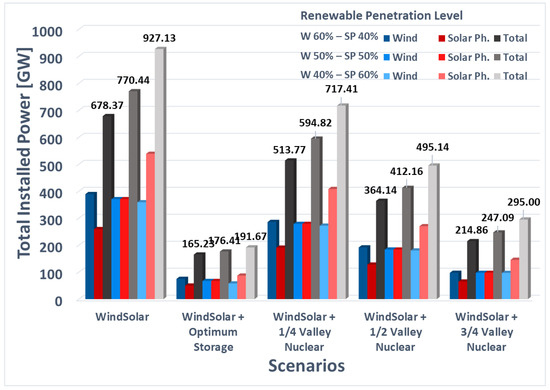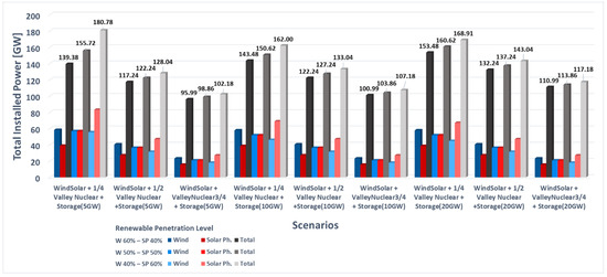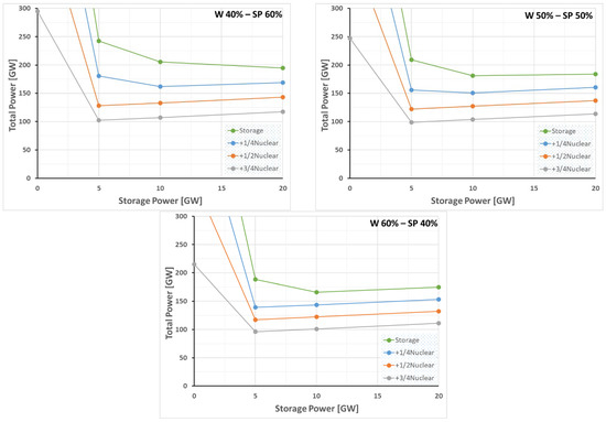 The combined use of renewable energies supported by both technologies—nuclear generation and storage technologies—would lead to even better achievements, as displayed in Figure 19. The renewable power to install reaches values of approximately 180 GW for the current nuclear power and storage capacity. Achieving even higher reductions, up to approximately 100 GW of total installed power, when increasing the nuclear installed power by a factor of 3 and the storage capacity by a factor of 4.