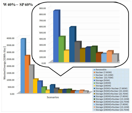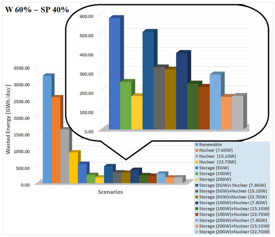 Wasted electrical energy wasted depending on the generation MIX (pure renewable, renewable with support of nuclear and/or storage) for the W 60%–SP 40% renewable penetration scenario.
