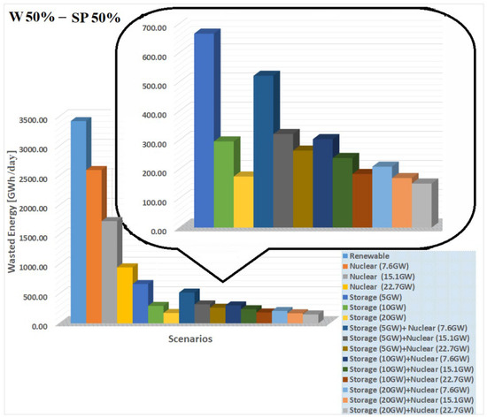 Wasted electrical energy wasted depending on the generation MIX (pure renewable, renewable with support of nuclear and/or storage) for the W 50% – SP 50% renewable penetration scenario.