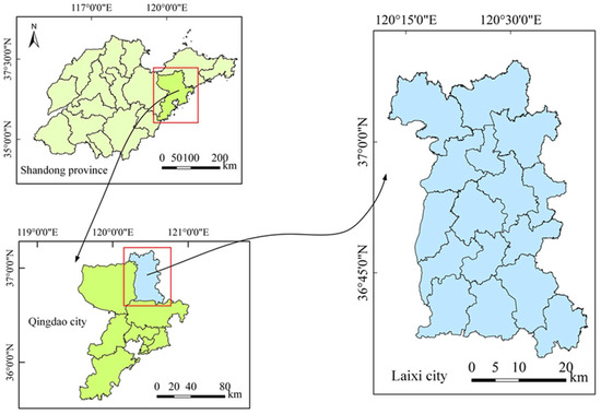 In this study, Laixi city was taken as the study area, and a three-layer integrated spatial scale system of Laixi city, Qingdao city, and Shandong province was constructed (Figure 1). Laixi city (36°34′~37°90′ N, 120°12′~120°40′ E) is located in the northeast of Qingdao, which belongs to the county-level city. It has a temperate continental monsoon climate and complex geomorphic types. The cultivated land area is stable at about 80,000 hectares, primarily including dry land, irrigated land, and vegetable land. The soil types are brown soil, alluvial soil, and black soil, etc., primarily planting wheat, maize, and peanut. The cultivated layer texture is primarily light loam and medium loam soil, and the texture configuration is primarily clay interlayer, with a deep soil layer. The city is a national modern agricultural demonstration area and an advanced county in grain production. Moreover, Qingdao city (35°35′~37°90′ N, 119°30′~121°00′ E) is located in the south of Shandong Peninsula, bordering the Yellow Sea to the east and south. The topography is high in the east and low in the west. The cultivated land in Qingdao is primarily dry land and irrigated land, with about 500,000 hectares. The soil is primarily brown soil and black soil. The cultivated layer texture is primarily light loam soil, the texture configuration is primarily clay interlayer, and the main crops are wheat, corn, cotton, etc., with a high agricultural development level. Furthermore, Shandong province (34°22′~38°24′ N, 114°47′~122°42′ E) is located in the east of China, with the Bohai Sea in the north and the Yellow Sea in the east and south. The topography is high in the middle and low around. The cultivated land area remained stable at about 7 million hectares, mainly including irrigated and dry land. The soils include brown soil, cinnamon soil, and 15 other soil types. The cultivated layer texture is primarily light, medium, and sandy loam soil. The texture configuration is primarily loam and clay interlayer, with a deep soil layer. Wheat and maize are the main grain crops, and cotton and peanut are the main cash crops, with a high agricultural modernization and industrialization level. In conclusion, the selected study areas are similar in agricultural development, so conducting multi-scale research on CLQ is typical and feasible.