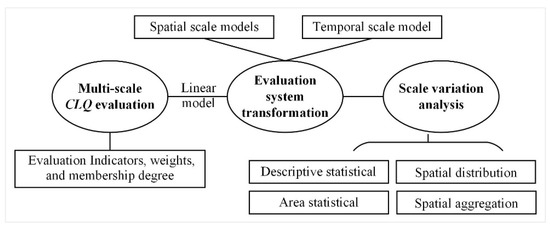 According to the characteristics of different study areas, the corresponding evaluation indicators, indicator weights, and membership degree were selected to evaluate the CLQ in each region. Then, the CLQ evaluation results transformation at multiple scales was carried out, which is divided into two steps: