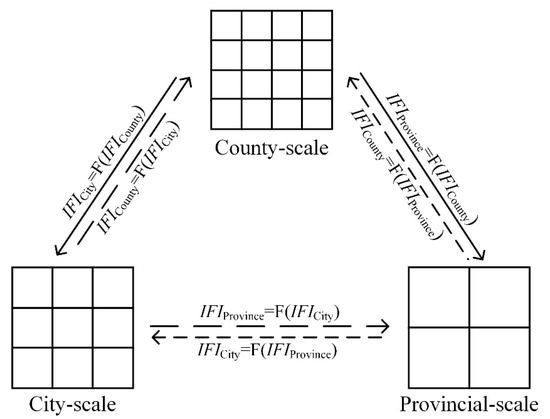 Figure 5 and Table 2 reflect the cumulative frequency curve characteristics and mathematical statistics characteristics of IFI at different scales in the same region, respectively. Figure 5 shows that the cumulative frequency curve of IFI at different scales in the same region has similar changes. As shown in Table 2, with the administrative scale increases from the county perspective, the evaluation units’ number decreases, and the IFI scope gradually narrowed. The average and median first decrease and then increase, while the standard deviation and coefficient of variation first increase and then decrease. Among them, the CV is 8.65% at the provincial-scale, with weak variability, and the CV is better than 11.90% at the county-scale and city-scale, with medium variability. From the city perspective, the evaluation units number decreases, the average and median of IFI increase, and the standard deviation and coefficient of variation decrease and has moderate variability, which is consistent with the observation law in the county.