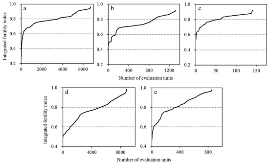 Cumulative frequency curves of Integrated Fertility Index ((a). Laixi at county-scale; (b). Laixi at city-scale; (c). Laixi at provincial-scale; (d). Qingdao at city-scale; (e). Qingdao at provincial-scale).