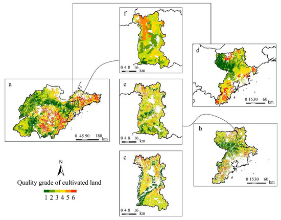 Spatial distribution map of CLQ grades ((a). Shandong province; (b). Qingdao at city-scale; (c). Laixi at county-scale; (d). Qingdao at provincial-scale; (e). Laixi at city-scale; (f). Laixi at provincial-scale).
