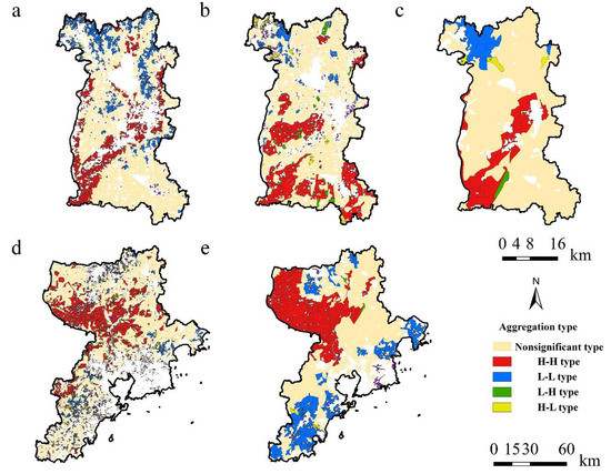 Local spatial association and aggregation of CLQ ((a). Laixi at county-scale; (b). Laixi at city-scale; (c). Laixi at provincial-scale; (d). Qingdao at city-scale; (e). Qingdao at provincial-scale).