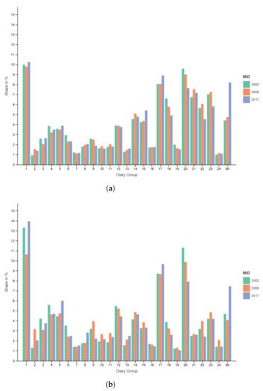 The distribution for all regions and all days can be seen in Figure 3a and for metropolitan regions from Tuesday to Thursday in Figure 3b. One can see that share of working (1–10) and educational (11–13, 24) diaries is higher for the core weekdays. Furthermore, a drastic decrease in free time diaries of persons who (usually) work (21) or go to an educational institution (22) with a smaller reduction for non-working people (23) is visible when comparing the two filters.