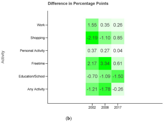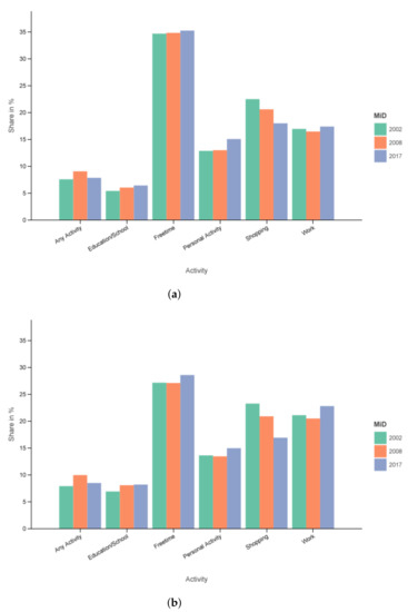 The probability distributions remain unchanged and specific to a single survey year, as seen in Equation (1). The activity shares of the respective year and filter are displayed in Table 6. Looking at the development of activity behavior again one can see a similar picture compared to the data from Table 5 with personal activities, shopping, and work matching the trend, free time, and any activity failing and educational trips doing both with the corresponding filter.