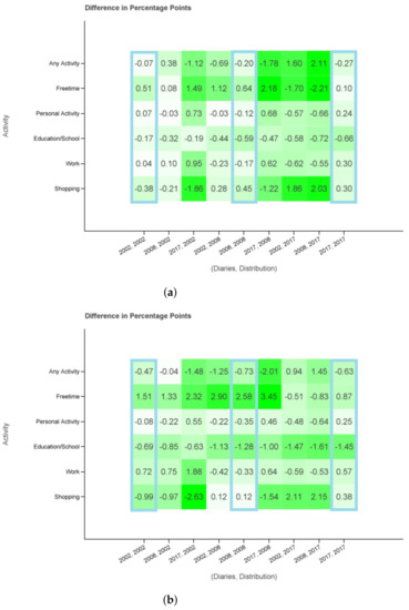 Figure 5 presents the difference between Table 4 and Table 5. In more detail, the figure shows the result of with in respect to and in regard to diaries . The same is done for Filter 2 and the corresponding sets. In the x axis, the first number corresponds to year x and the second to year y. The maximal absolute error in (2002, 2002), (2008, 2008), (2017, 2017) is below one percentage point for Filter 1 and increases to 2.58 percentage points difference for Filter 2. The bigger error for the latter one may be because of the used diaries of all regions and days which are not representative of bigger cities and core workdays. One example causing this effect might be having less free time in the core week. Especially for the columns where the year of the used diaries coincides with the year of the used probability distributions have very low differences. Considering all columns the absolute maximum error increases to 2.21 and 3.45 percentage points, respectively.